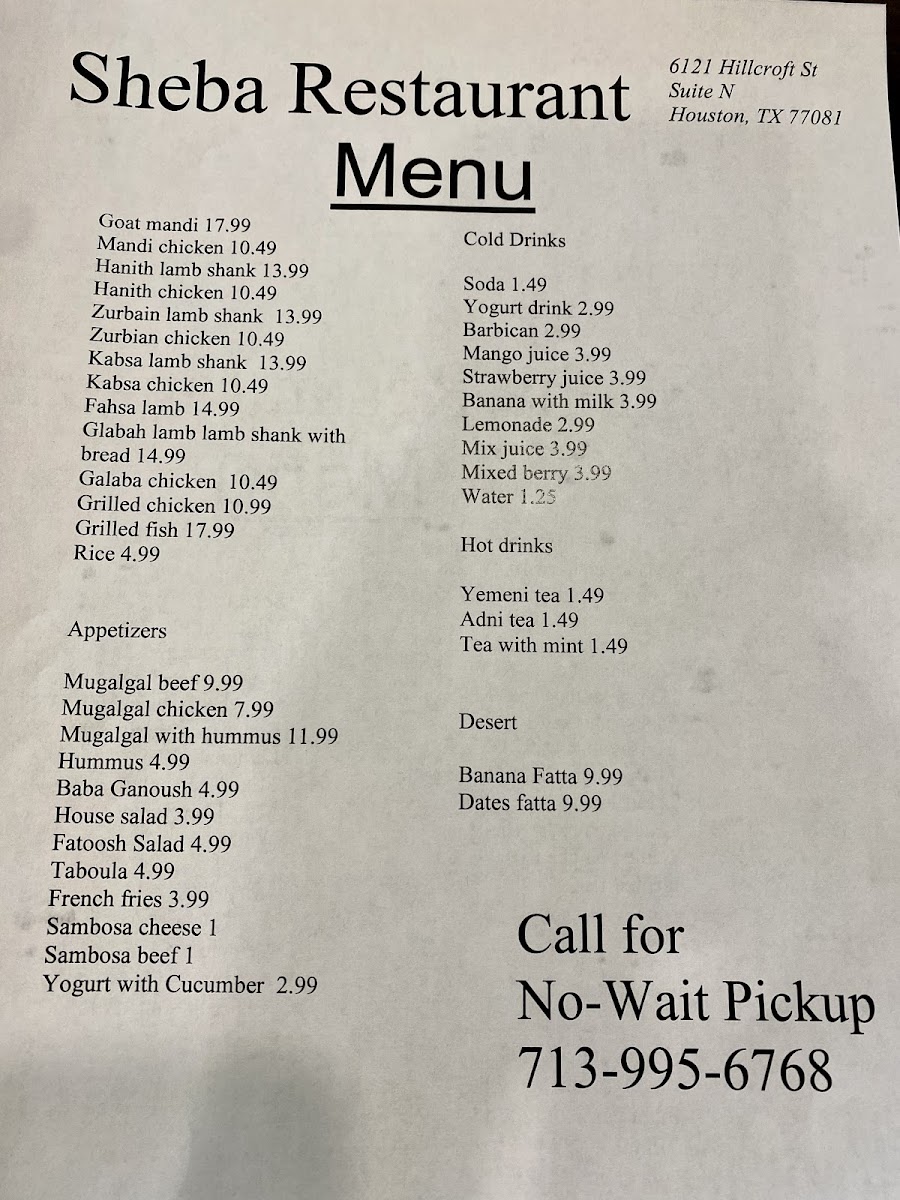 Located in Houston, TX, Sheba offers an authentic taste of Yemeni cuisine that captivates the palate. The menu features a delightful array of dishes, focusing on flavorsome main courses such as the renowned Goat Mandi and Hanith Lamb, both known for their tender meats and aromatic spices. For poultry lovers, the Mandi Chicken and Grilled Chicken provide satisfying options at accessible prices.